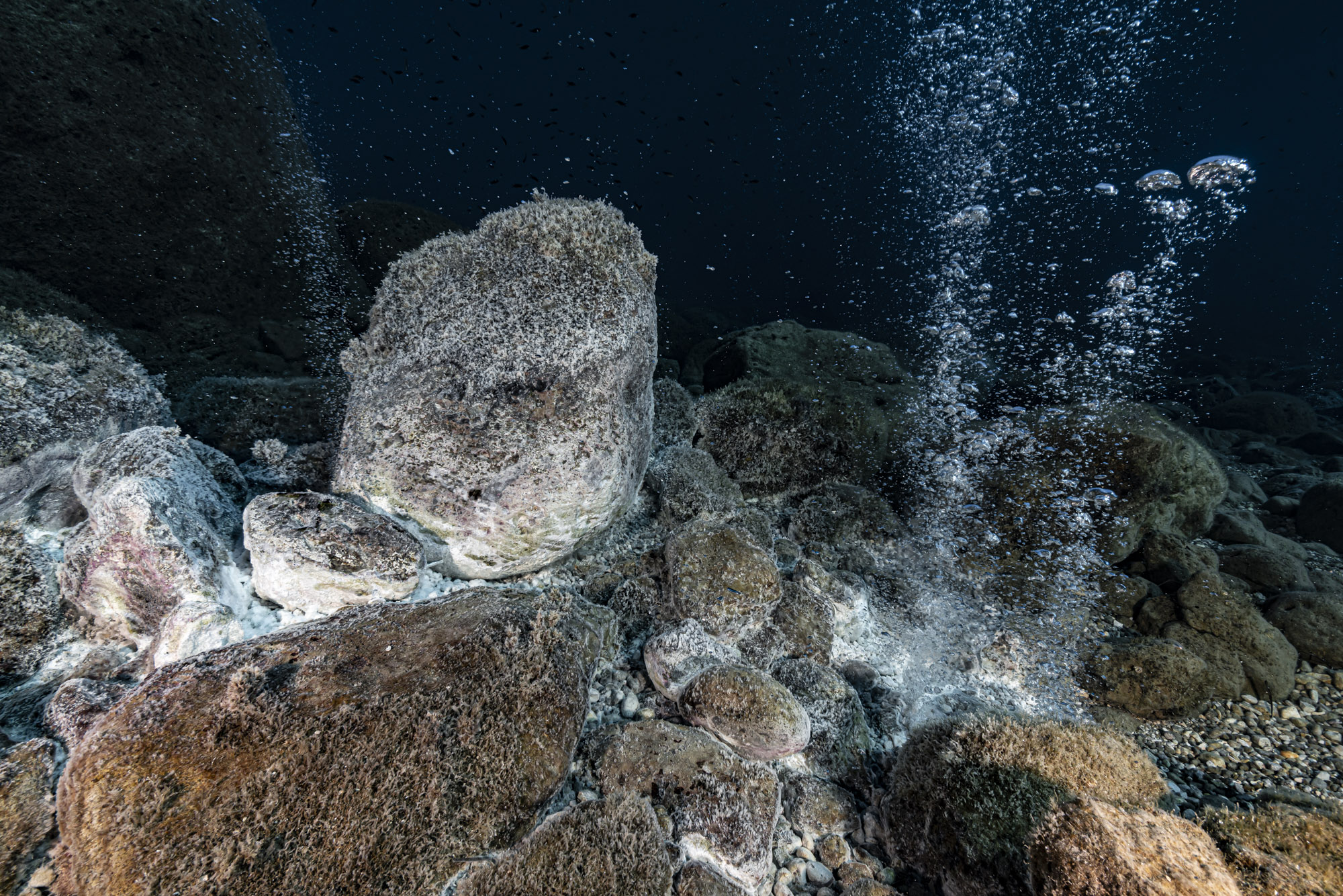 La première plongée est époustouflante : à seulement quelques mètres de profondeur, des éruptions permanentes de gaz venant directement de la chambre magmatique du volcan s’échappent des entrailles de la Terre pour former d’impressionnants rideaux de bulles. Dans la caldeira, certains sites dégagent plus d’un million de litres de gaz par jour.