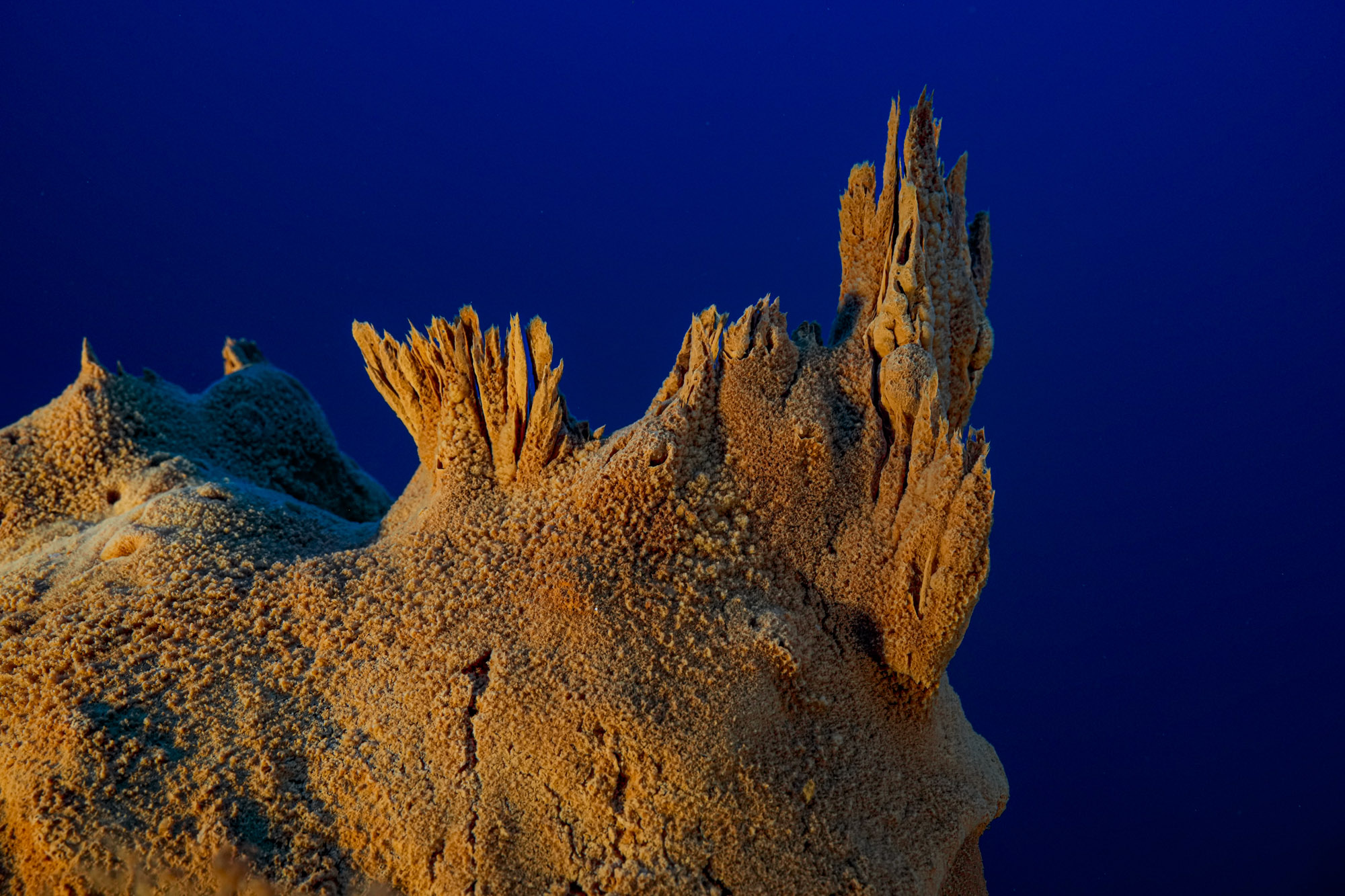 La suite de notre exploration nous emmène bien plus profond, à plus de soixante-dix mètres de profondeur. Lors de leur dernière mission, les plongeurs de l’INGV ont fait la découverte d’un lieu d’exception : The Smoking Land. Les fonds marins y sont couverts de cheminées hydrothermales auxquelles le soufre a donné une couleur orange caractéristique. De manière continue, elles expulsent des fluides acides à haute température.